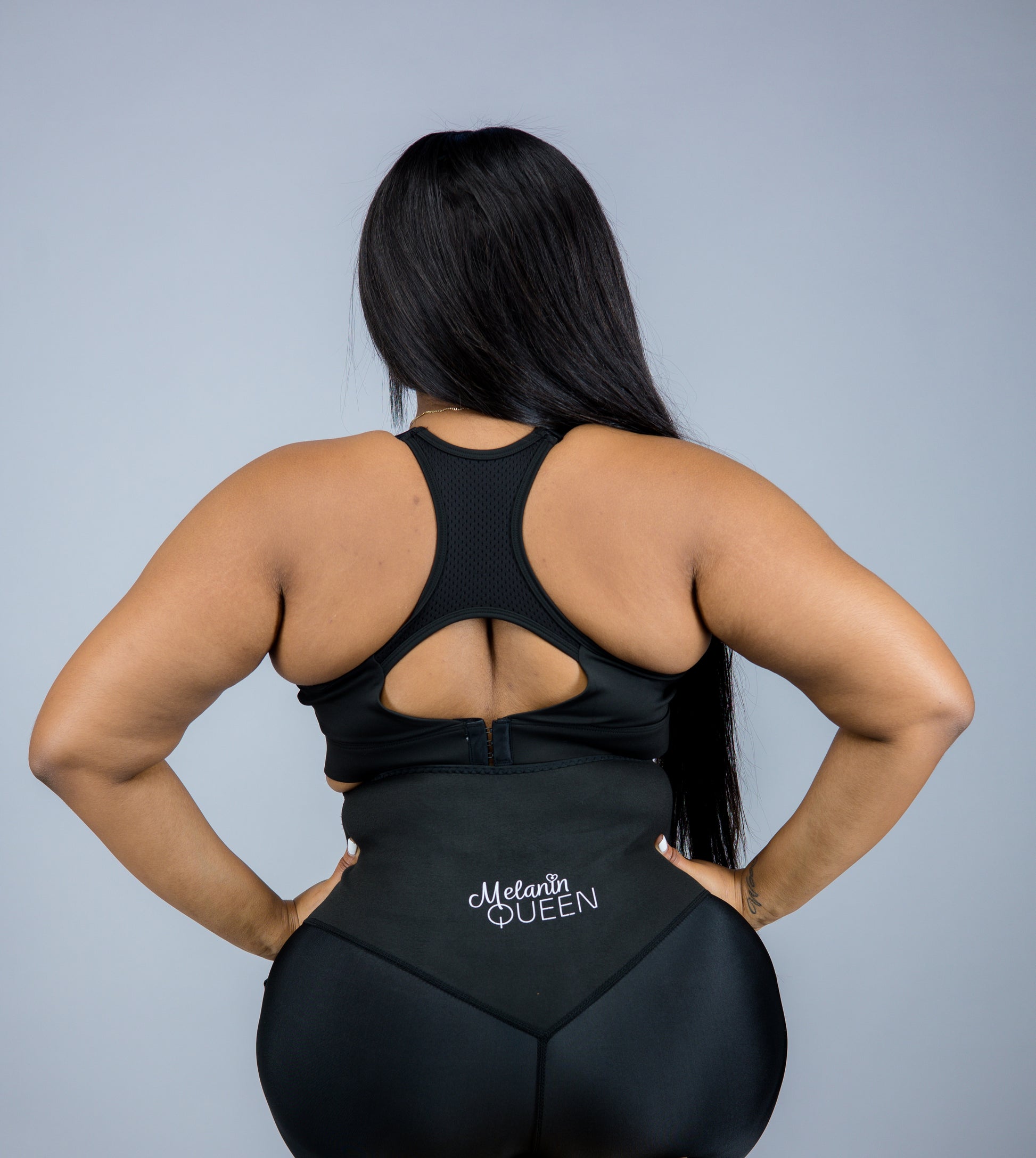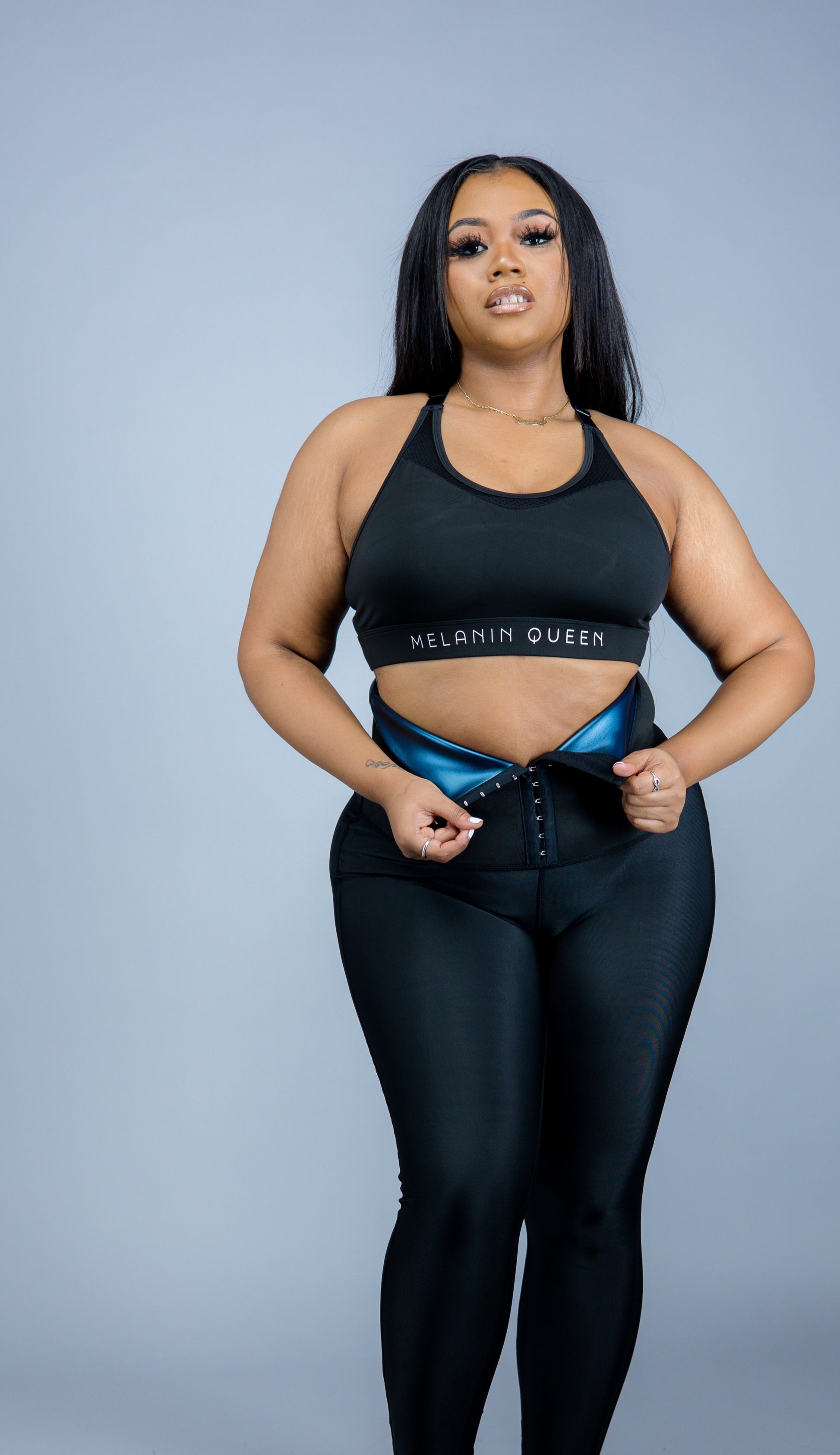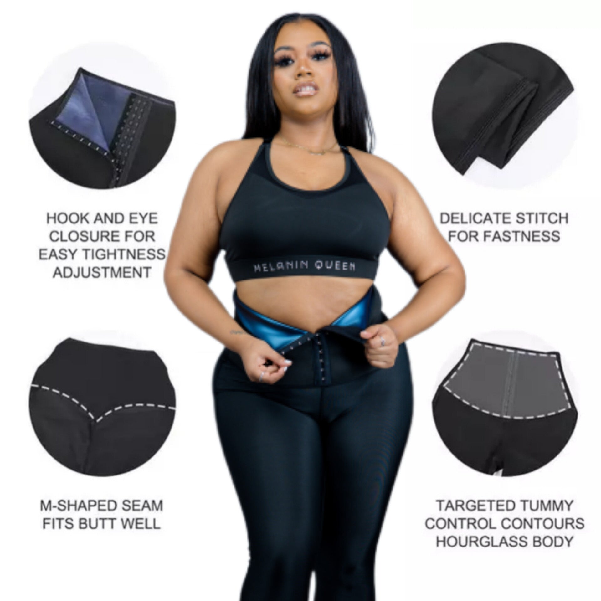 Get your best workout sweat with our sauna corset leggings. Designed with a neoprene and polyurethane coated fabric that covers the waist and stomach, these leggings are designed to increase sweating. It's high-waist design has three rows of hooks to provide the perfect contour and compression. And finally, the legs are made with a breathable fabric that is moisture wicking. This is like having a waist trainer and legging all in one!